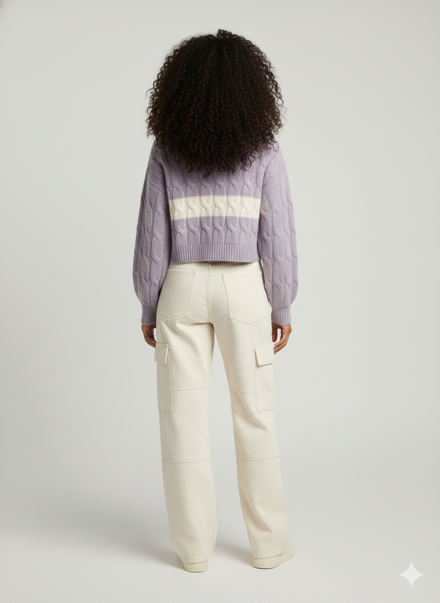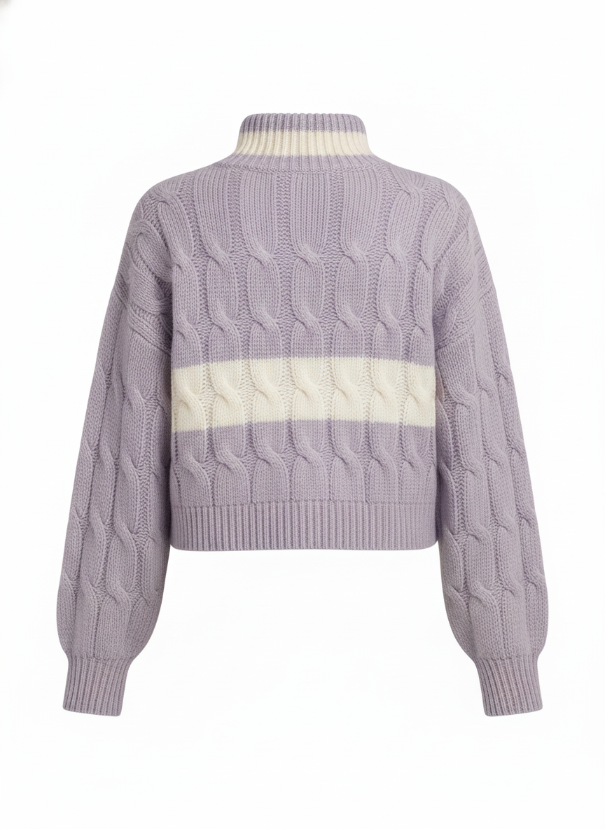 A premium cable-knit sweater designed with a structured high-neck collar and contrasting horizontal stripe detailing for elevated visual interest. The cropped silhouette combined with voluminous sleeves delivers a modern yet timeless winterwear proposition. Engineered for warmth, comfort, and style consistency across repeat wear cycles.